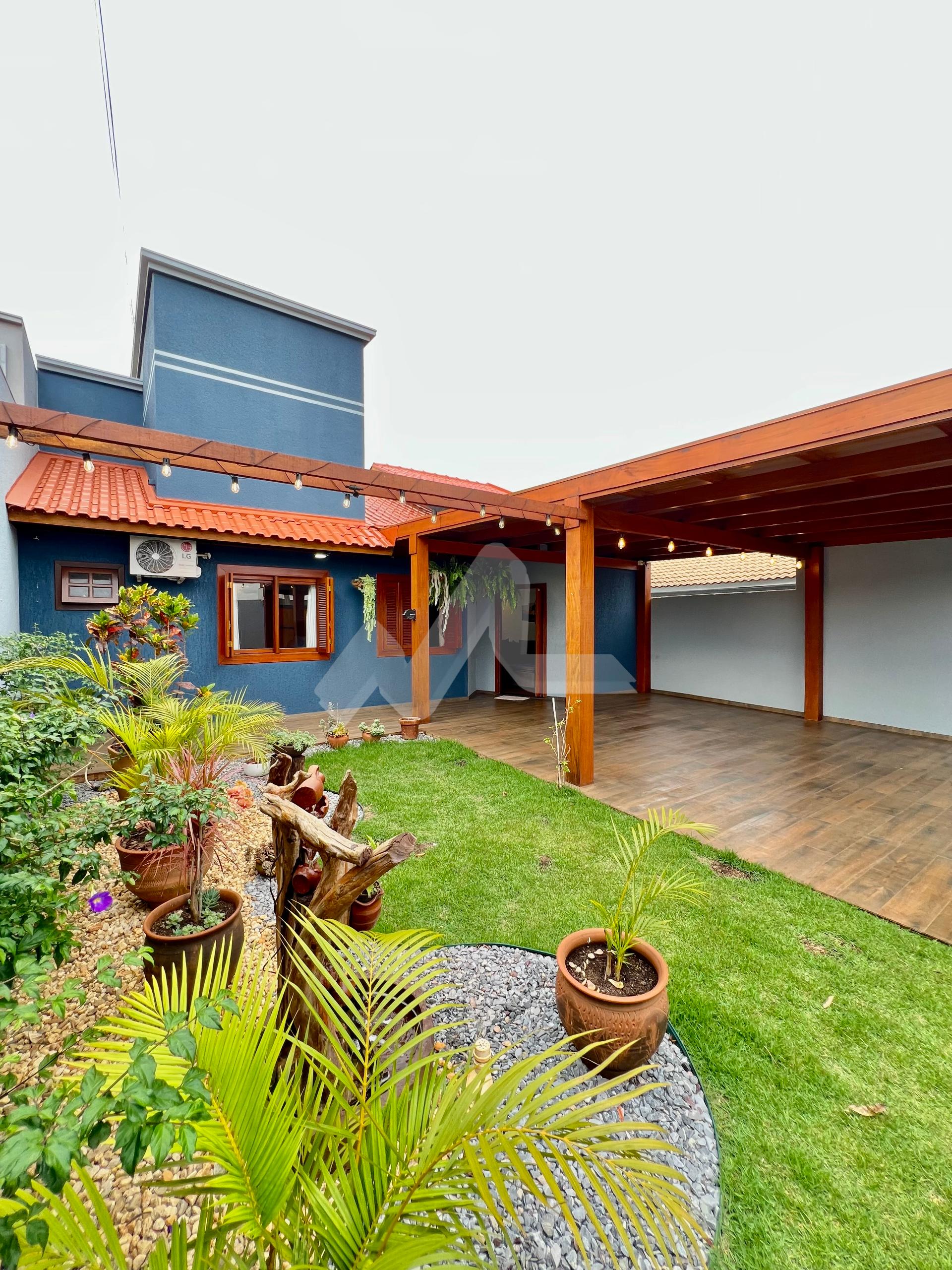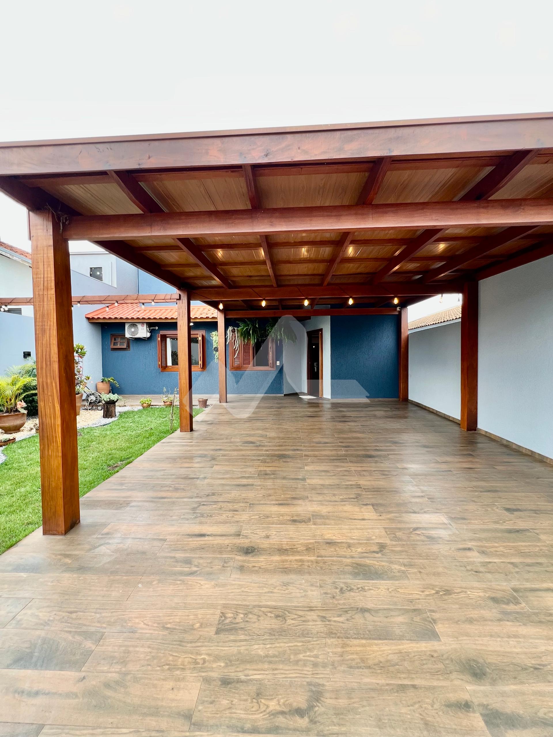 Garagem com perfilado em madeira e cobertura em telha sanduíche, acabamento amadeirado de forro, com 44m², para até 4 carros cobertos